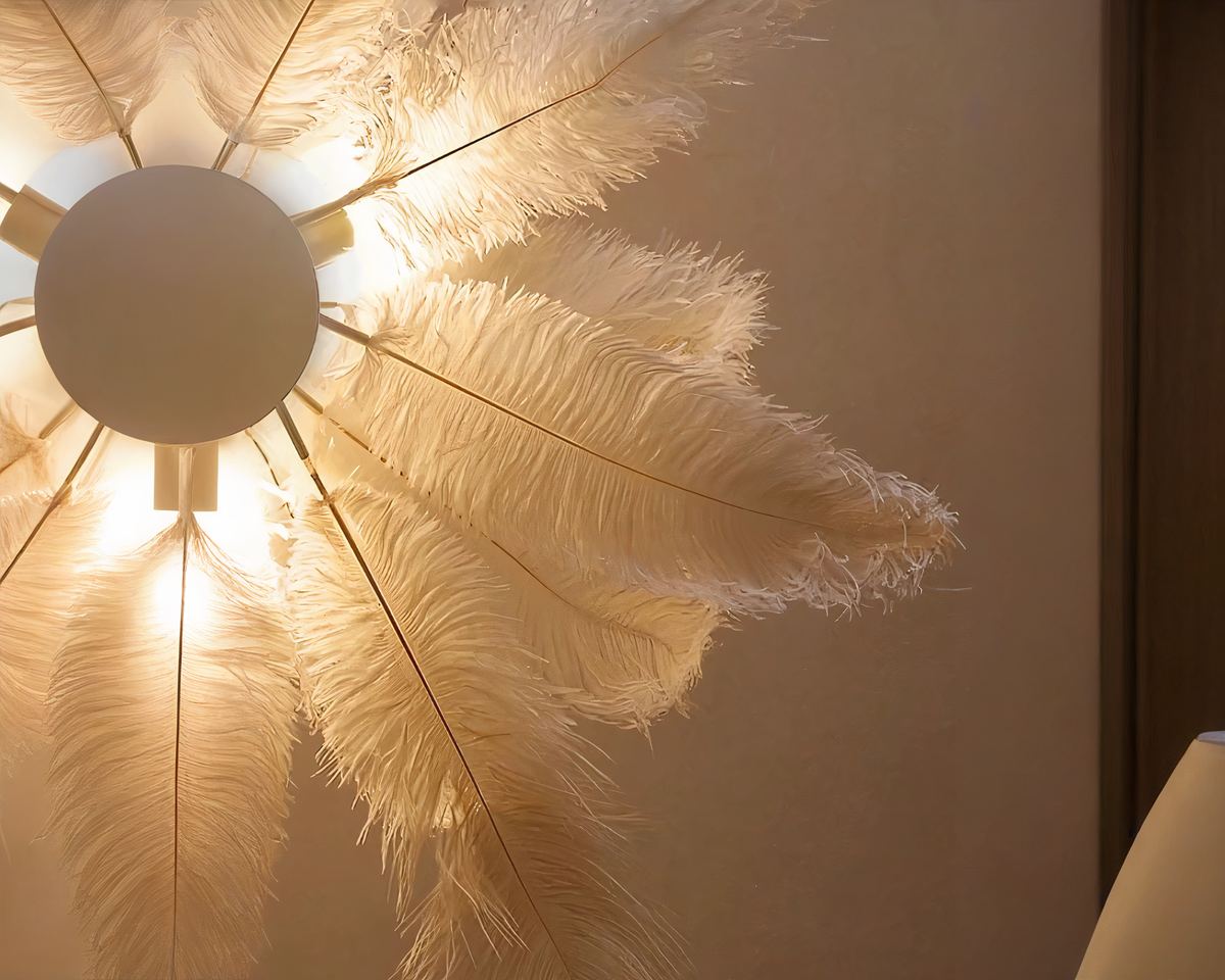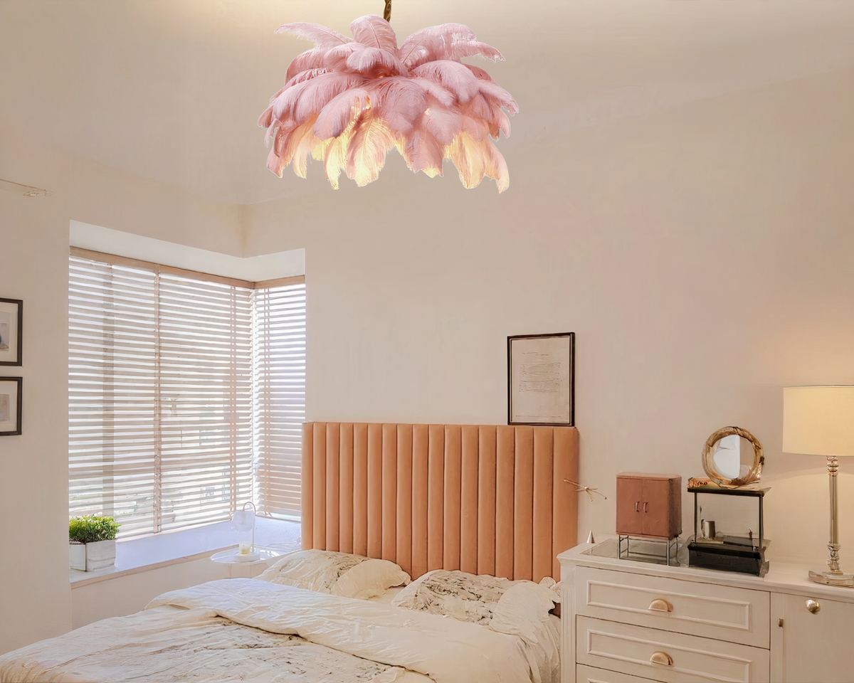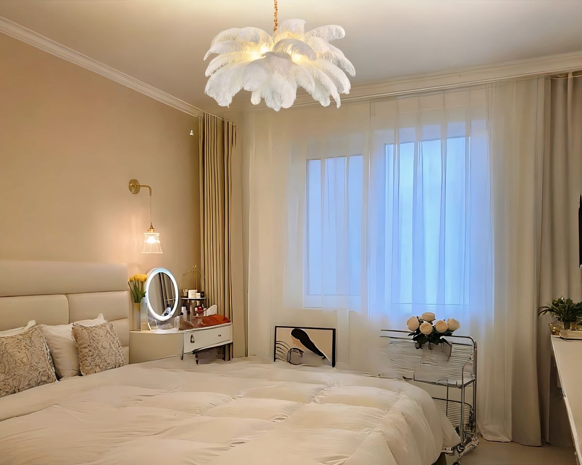 Ce lustre chambre cocooning à plumes diffuse une lumière douce comme une caresse, créant une atmosphère propice à la détente. Chaque plume semble flotter délicatement, adoucissant l'éclairage pour offrir une sensation de confort absolu.