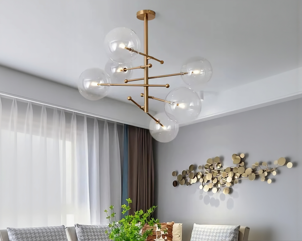 Chaque globe en verre semble flotter autour dโun axe central ร la finition bronze รฉlรฉgante, รฉvoquant un mobile artistique suspendu dans lโair. Ce contraste subtil entre transparence et structure crรฉe un effet visuel captivant, tout en douceur.