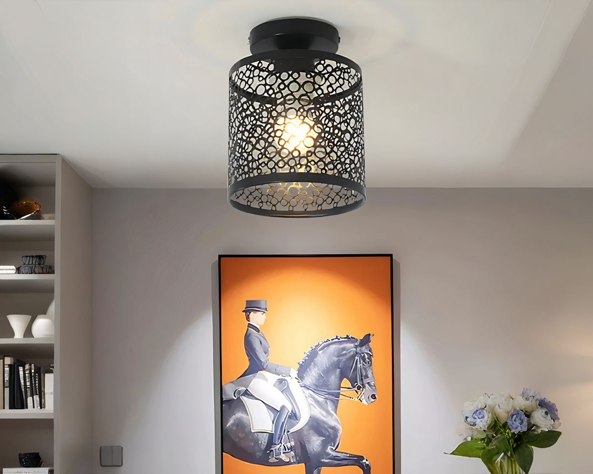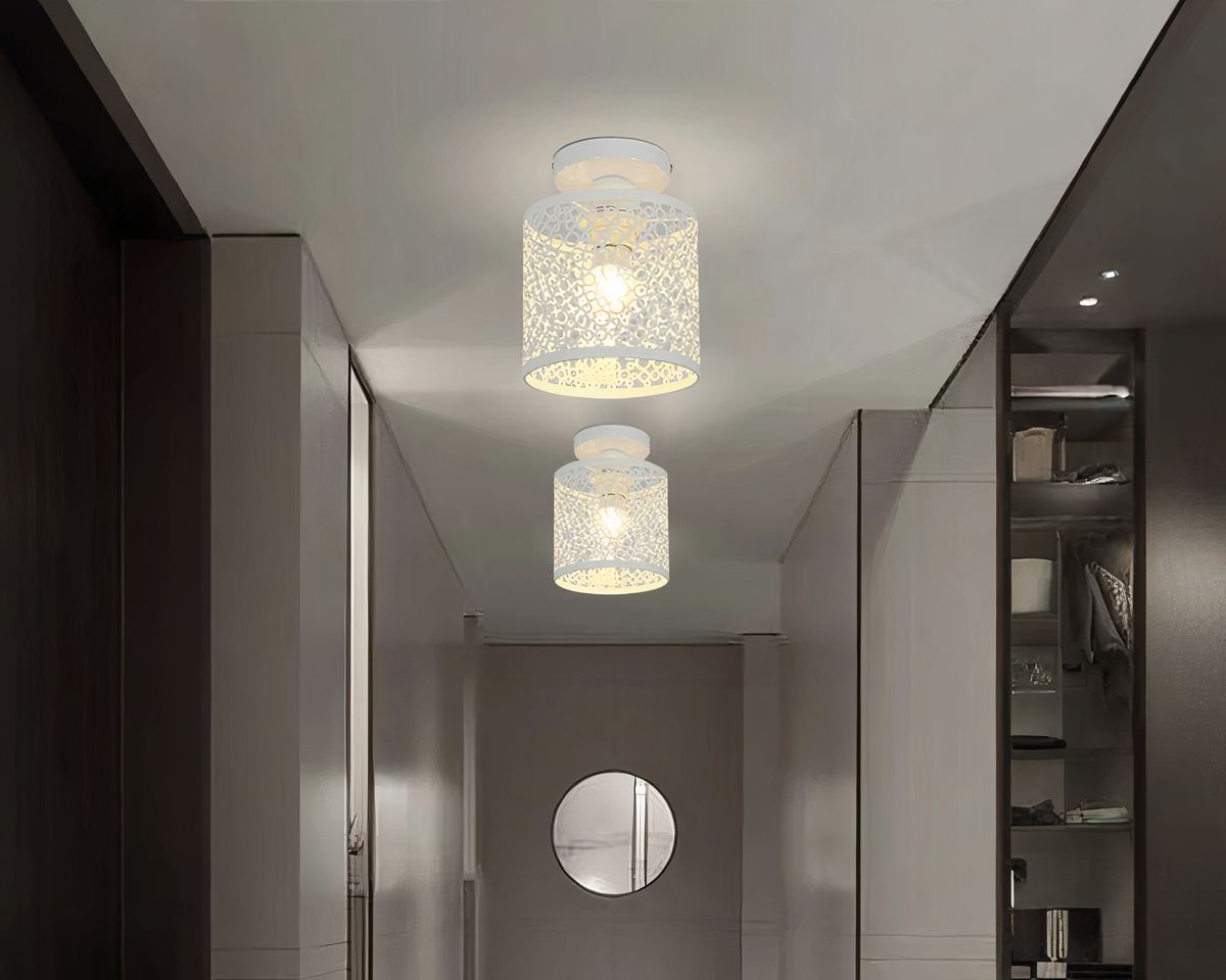 Le charme de ce plafonnier réside dans son abat-jour en métal ajouré, disponible en deux coloris élégants : noir ou blanc. Le motif ajouré joue avec la lumière pour créer des ombres délicates sur vos murs et plafond, ajoutant ainsi une dimension visuelle captivante à votre entrée.