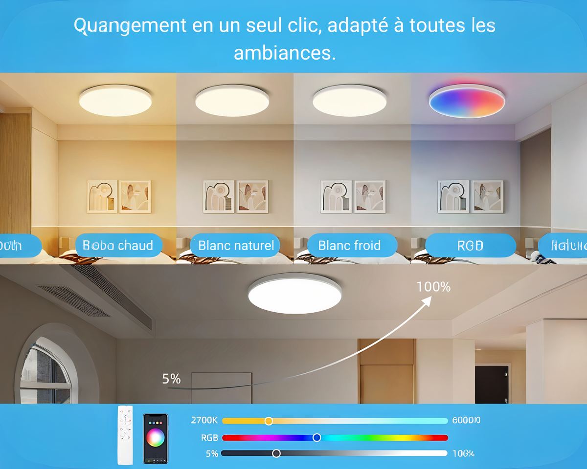 Avec lโapplication mobile ou la tรฉlรฉcommande, modifiez instantanรฉment la couleur, lโintensitรฉ ou mรชme le mode dโรฉclairage sans bouger de votre place. Passez en mode dรฉtente avec une lumiรจre tamisรฉe ou en mode dynamique pour un รฉclairage plus vif en un simple clic.